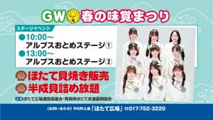 GW春の味覚まつり お知らせ 2026-04-25 5月3日(日)イベント開催いたします。 ほたて広場9時開店。ほたて貝焼き販売・半成貝詰め放題も9時から始まります😊 この他にも試食などなどいろいろ盛りだくさんでご用意しております。 ぜひお越しください‼ みなさまのお越しをお待ちしております。